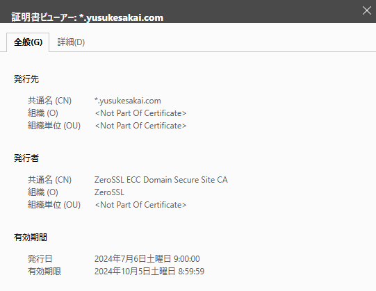 また、設定後に対象のサイトにアクセスすると、ZeroSSLのワイルドカード証明書が発行されていることを確認できます。