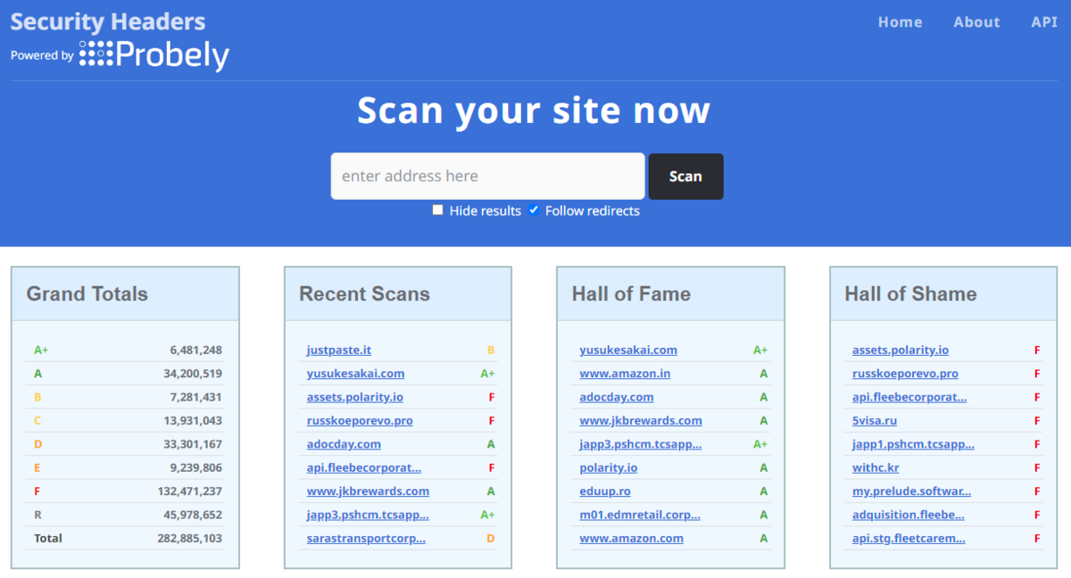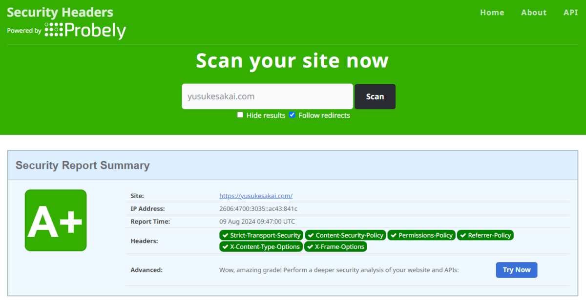ここにURLを入力すると、どんなサイトでも瞬時に採点してくれるのですが、最高評価のA+を取得するのはなかなか難しいようで、2024/8/9現在でサイト全体のたった2%程度しかありません。