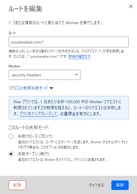 注意点として、Cloudflare Workersの無料枠が10万リクエスト/日のため、アクセス数の多いサイトは厳しいです。ただし、Workerの設定で「Fail open (proceed)」(日本語で「失敗オープン(続行)」)を選択すると、リクエスト上限を超えたら自動でWorkerを迂回してくれるので、勝手に課金されたりアクセス不可になることはありません。