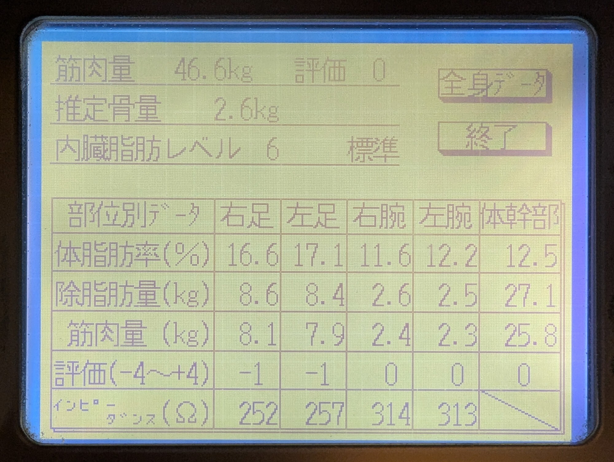タニタの高性能な体組成計もあったので記念に計ってみました。測定項目の見方は公式サイトを参照。体脂肪率が標準の範囲内でよかったです。
