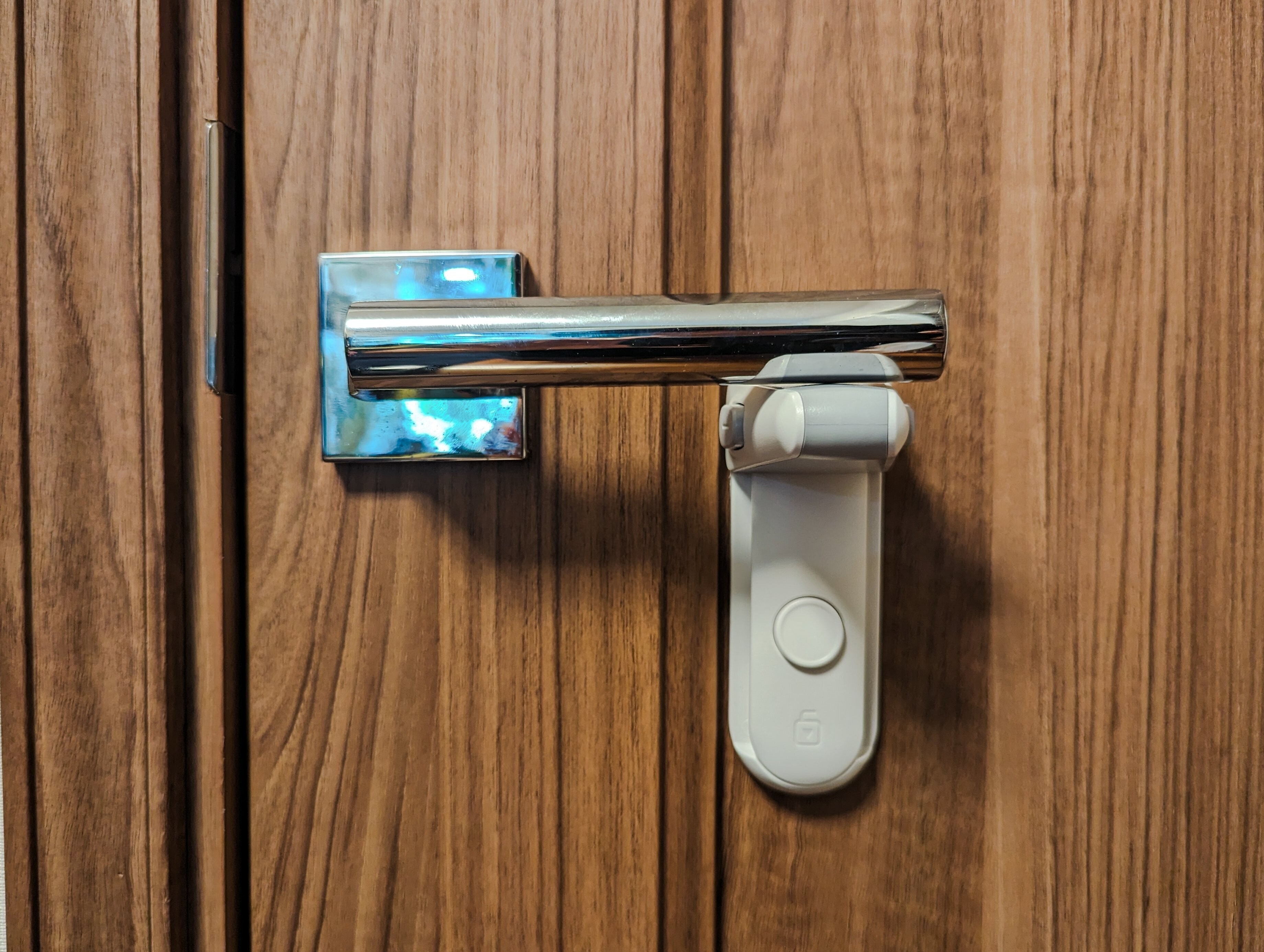 鍵のないドアに貼り付けるタイプのドアロック。「ドアノブを下に押せないようにする」という極めて原始的なロック方式ではあるものの、とにかくシンプルで使い勝手良いです。