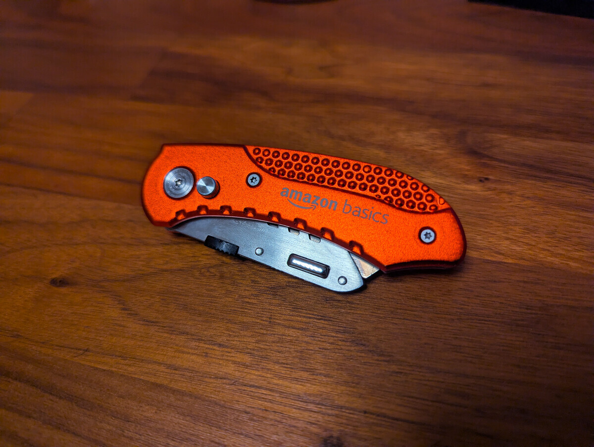 Amazonブランドのちょっとかっこいいカッターナイフ。色とデザインに惹かれて購入しました。柄がアルミ製で、「軽量」と書いてますがまあまあ重いです。